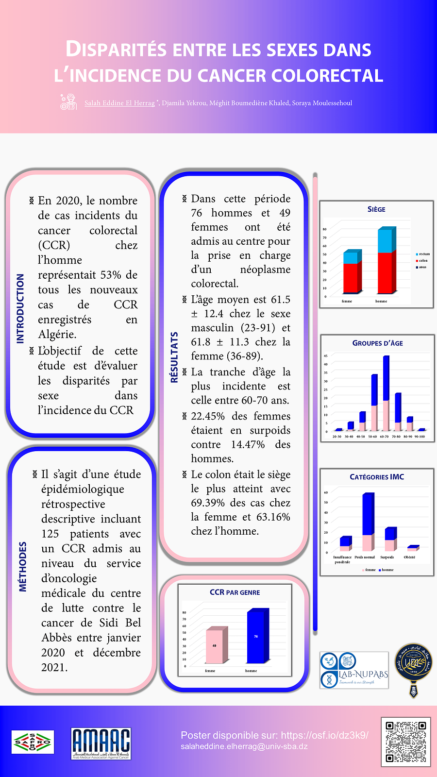 El Herrag, Salah Eddine, et al. Disparités Entre Les Sexes Dans l’Incidence Du Cancer Colorectal. Arab Medical Association Against Cancer (AMAAC) and Algerian Society Of Training & Research In Oncology (SAFRO), 2022.