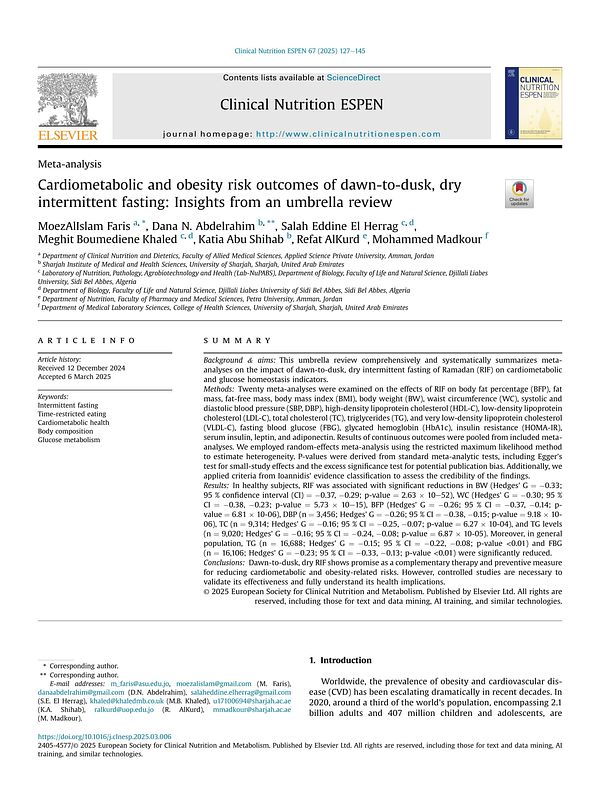 Faris, M. A. I., Abdelrahim, D. N., El Herrag, S. E., Khaled, M. B., Shihab, K. A., AlKurd, R., & Madkour, M. (2025). Cardiometabolic and Obesity Risk Outcomes of Dawn-to-Dusk, Dry Intermittent Fasting: Insights from an Umbrella Review. Clinical Nutrition ESPEN, 67, 127–145. https://doi.org/10.1016/j.clnesp.2025.03.006